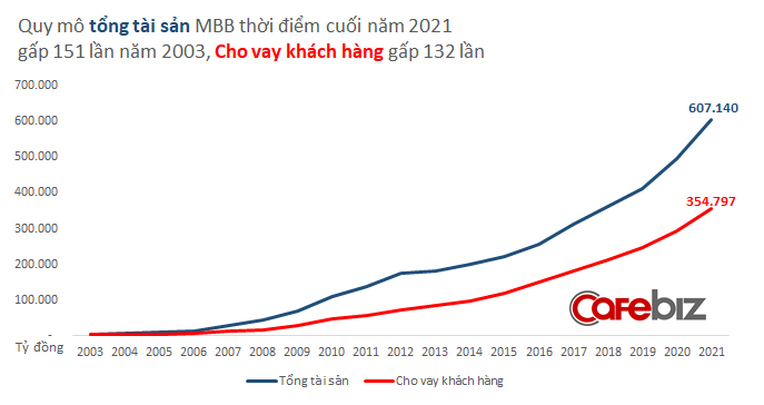 Dư nợ cho vay khách hàng của MBBank cũng tăng ấn tượng khi quy mô tăng gấp lần 132 lần. Tổng tài sản gấp 151 lần so với thời điểm cuối năm 2003.