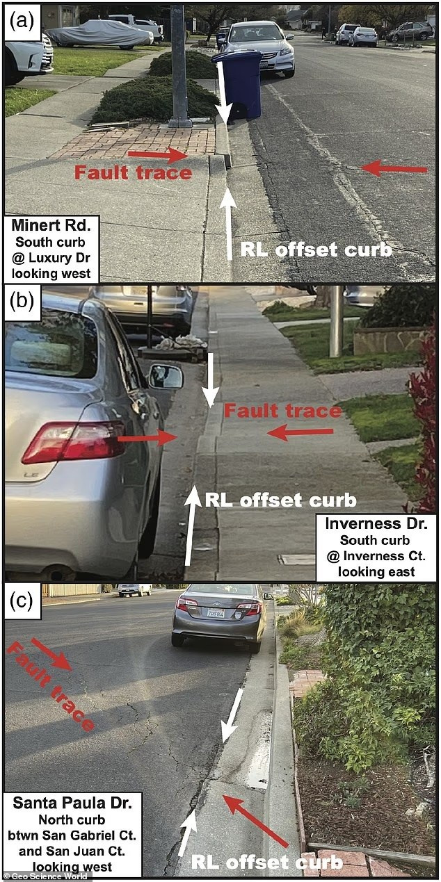 Các bức ảnh cho thấy lề đường nứt nẻ và vỉa hè bị dịch chuyển trên các đường phố East Bay, cho thấy một đường đứt gãy đang di chuyển bên dưới. Các vạch trắng biểu thị lề đường và vỉa hè bị đẩy, trong khi các vạch đỏ biểu thị chuyển động ngang. Những sự dịch chuyển này trùng khớp với dấu vết đứt gãy mới được xác định.