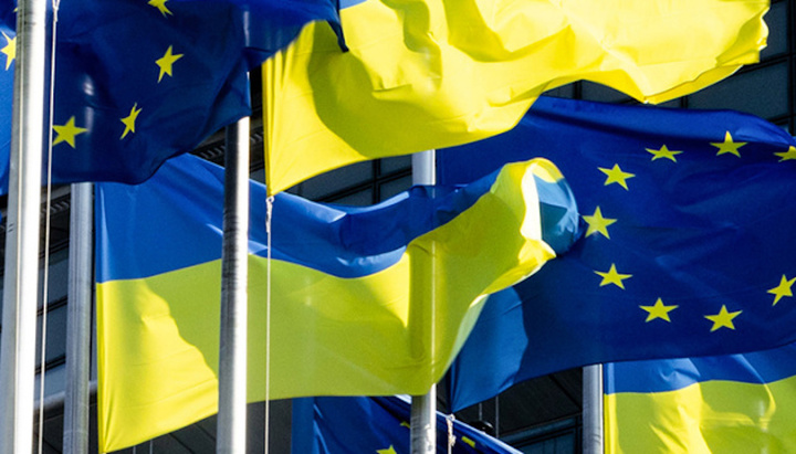 Cờ Ukraine bay bên cạnh cờ EU ở Kiev. (Ảnh: Getty)