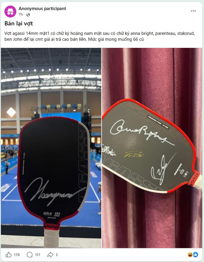 Thế nhưng ngay sau khi kết thúc giải đấu, cộng đồng Pickleball bất ngờ xôn xao với một bài đăng bán lại vợt có chữ ký của các ngôi sao với giá lên tới 66 triệu đồng.
