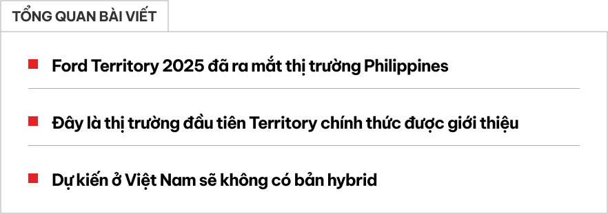 Ở Philippines, Ford Territory có giá bán quy đổi từ 616 triệu đồng, trong khi bản hybrid quy đổi từ 645 triệu đồng. Giá này mềm hơn ở Việt Nam rất nhiều ngay cả khi Philippines không có bản Trend như Việt Nam.