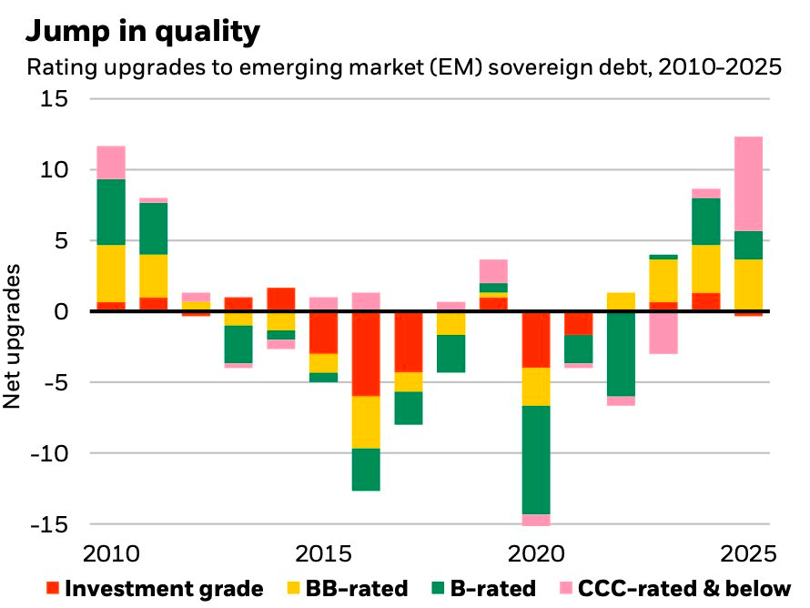 BlackRock nhận thấy cơ hội ở trái phiếu EM bằng ngoại tệ mạnh và đã chuyển sang tăng tỷ trọng. Đồng USD yếu hơn, lãi suất Mỹ thấp hơn cùng với chính sách tài khóa và tiền tệ thận trọng đã cải thiện nền tảng tín dụng của các thị trường mới nổi, thể hiện qua hàng loạt đợt nâng hạng tín nhiệm quốc gia. Chênh lệch lợi suất hiện đang ở mức thấp nhất trong nhiều thập kỷ trên nhiều khu vực, được hỗ trợ bởi nguồn cung phát hành hạn chế và bảng cân đối tài chính vững mạnh hơn.