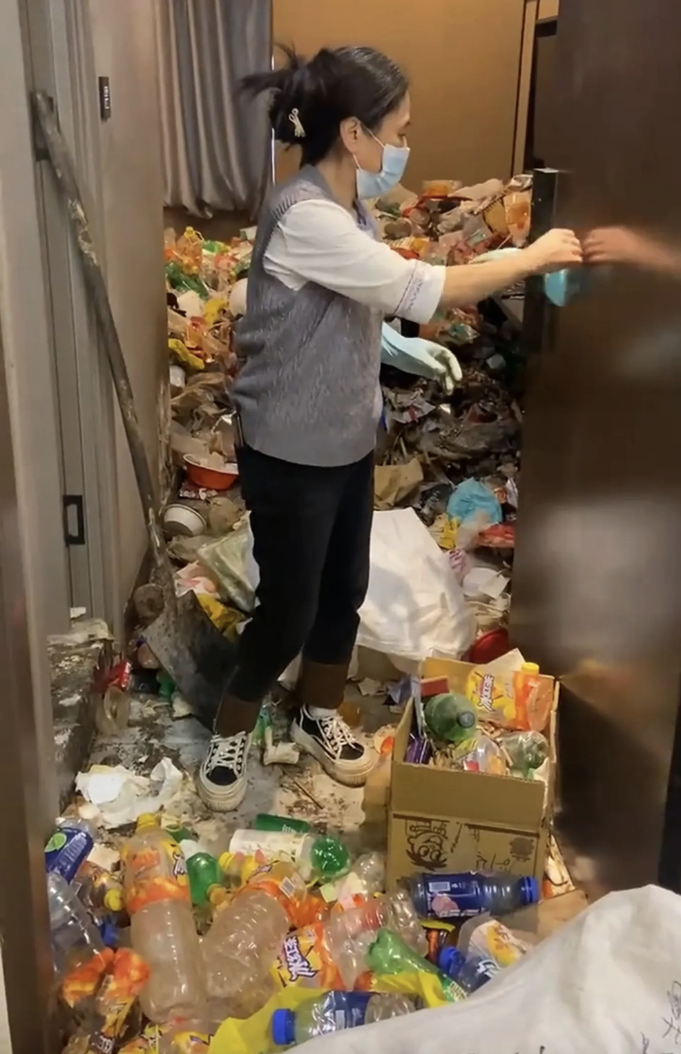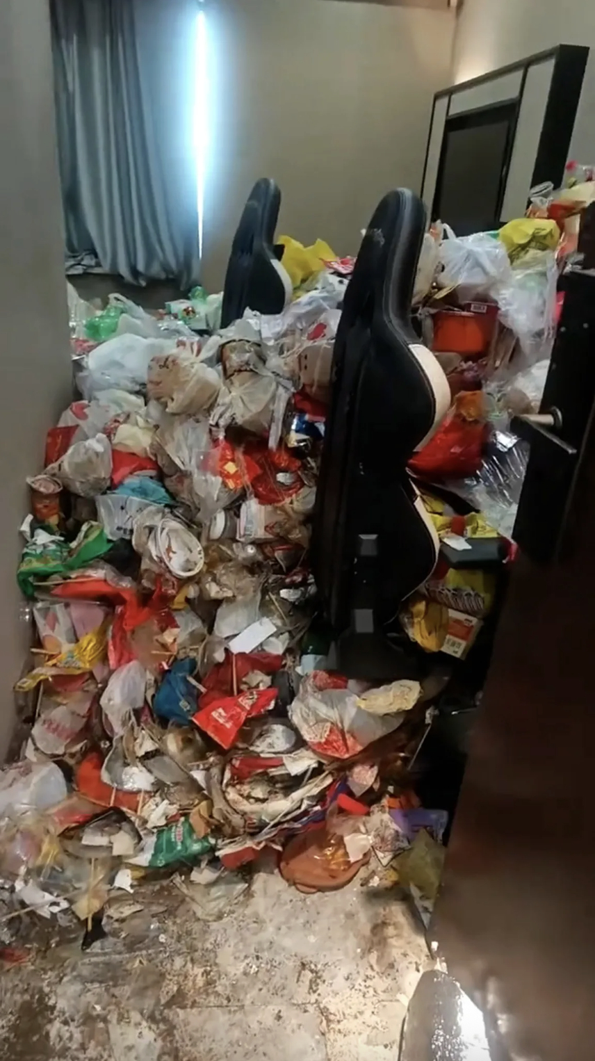 Đoạn video ghi lại hiện trường cho thấy khắp căn phòng chất đầy hàng nghìn vỏ đồ ăn, chai nước uống rỗng và các hộp thức ăn mang về. Rác thải bị nhồi nhét vào gần như mọi góc trong phòng, từ khu vực bàn làm việc cho đến lối đi.