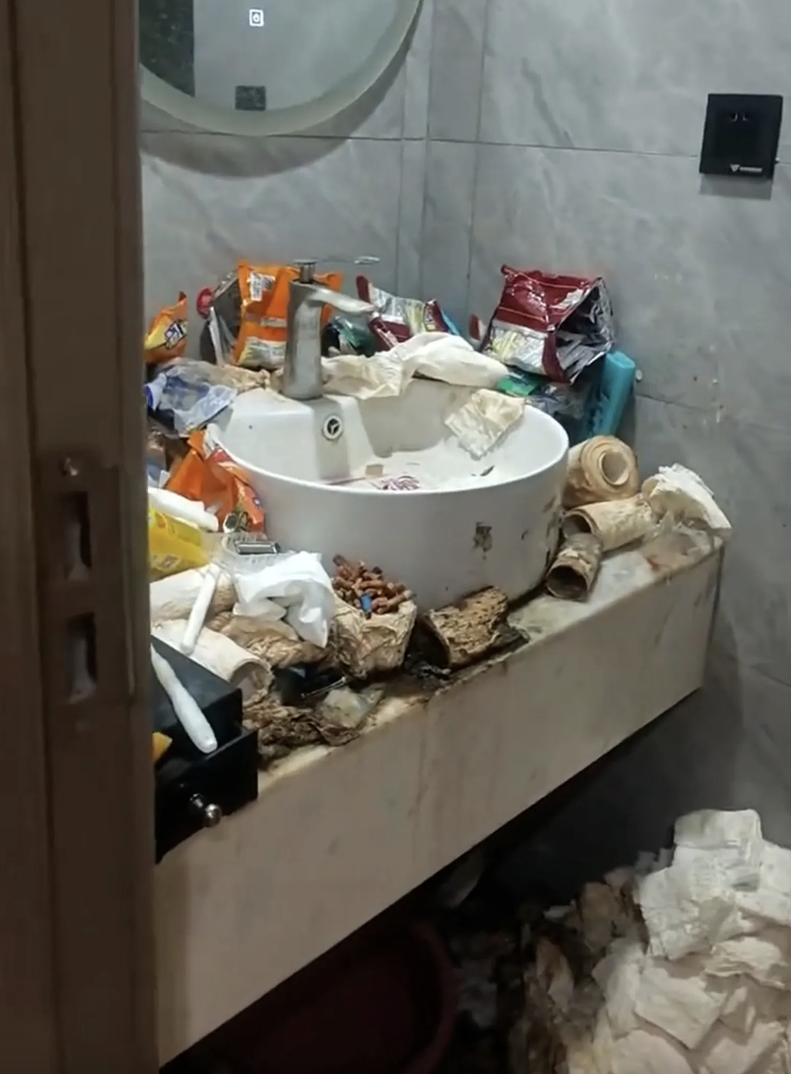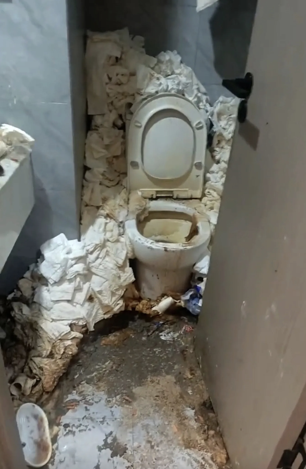 Tình trạng trong phòng tắm thậm chí còn khiến nhiều người bất ngờ hơn. Rác thải phủ kín gần như mọi bề mặt, trong đó giấy vệ sinh ướt đã dùng được chất thành đống cao hơn cả bồn cầu. Khu vực bồn rửa tay cũng bị bao phủ bởi nhiều vật dụng bỏ đi.