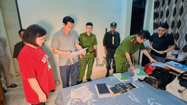 Cơ quan Cảnh sát điều tra Công an tỉnh thi hành lệnh khám xét tại nhà các đối tượng (Ảnh: Công an Lào Cai).