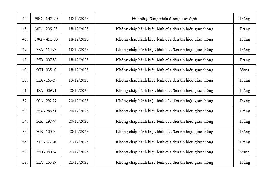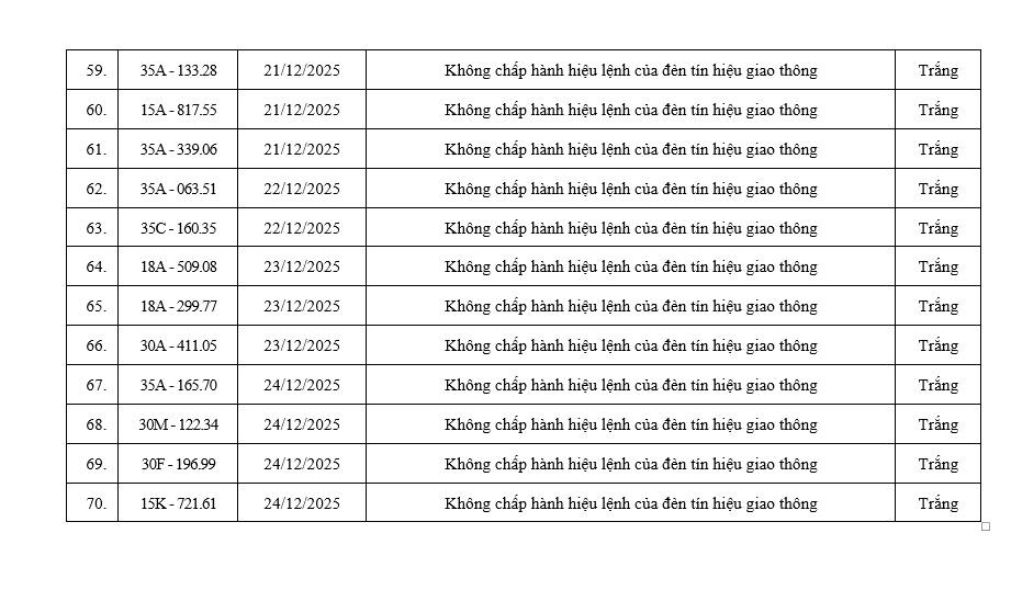 Trước đó, Công an tỉnh Ninh Bình cũng thông báo, từ ngày 16/12/2025 đến ngày 24/12/2025, Phòng Cảnh sát giao thông ghi nhận 70 trường hợp ô tô và xe máy vi phạm lỗi “Không chấp hành hiệu lệnh của đèn tín hiệu giao thông”. Danh sách cụ thể như sau: