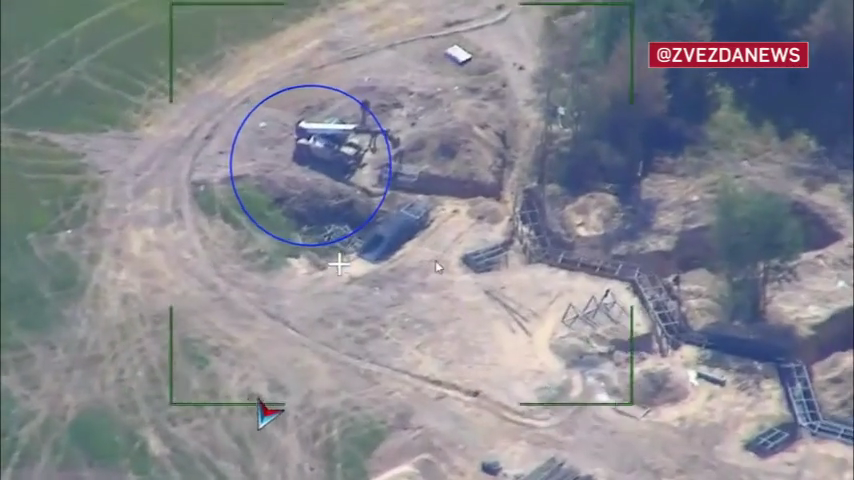 Video do Bộ Quốc phòng Nga công bố cho thấy các vị trí kiên cố của lực lượng Ukraine và hình ảnh một UAV trúng mục tiêu và sau đó là tiếng nổ.