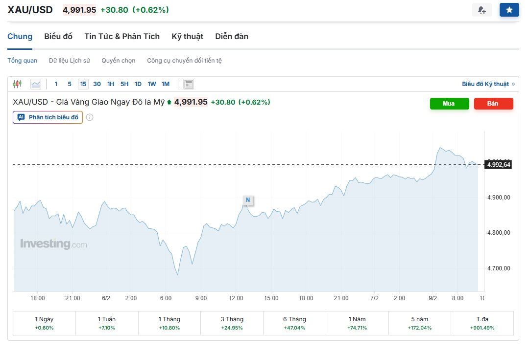 Tính đến sáng nay ngày 9/2/2026, giá vàng giao ngay trên sàn Kitco đã có thời điểm bứt phá lên mức 5.042 USD/ounce trước khi vấp phải áp lực chốt lời ngắn hạn và lùi về quanh vùng 4.990 USD/ounce. Việc vàng có thể "hít thở" lại bầu không khí trên mốc 5.000 USD được xem là một tín hiệu kỹ thuật quan trọng cho xu hướng của cả tháng này.