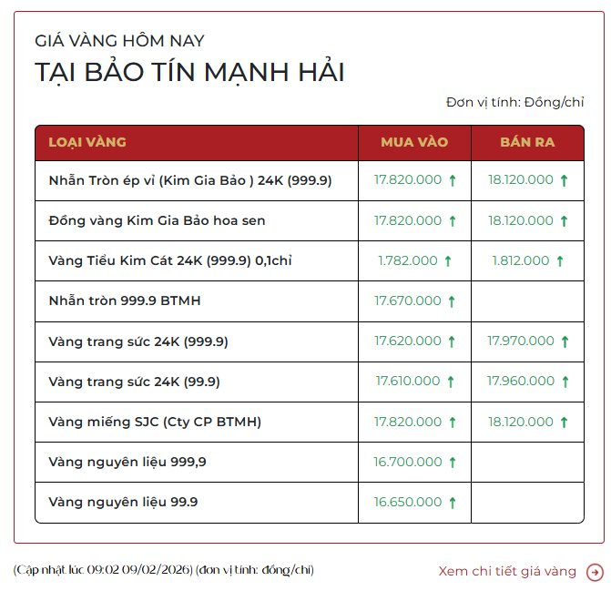 Sáng 9/2, giá vàng Kim Gia Bảo của Bảo Tín Mạnh Hải được niêm yết 178,2 triệu đồng-181,2 triệu đồng/lượng (mua vào-bán ra).