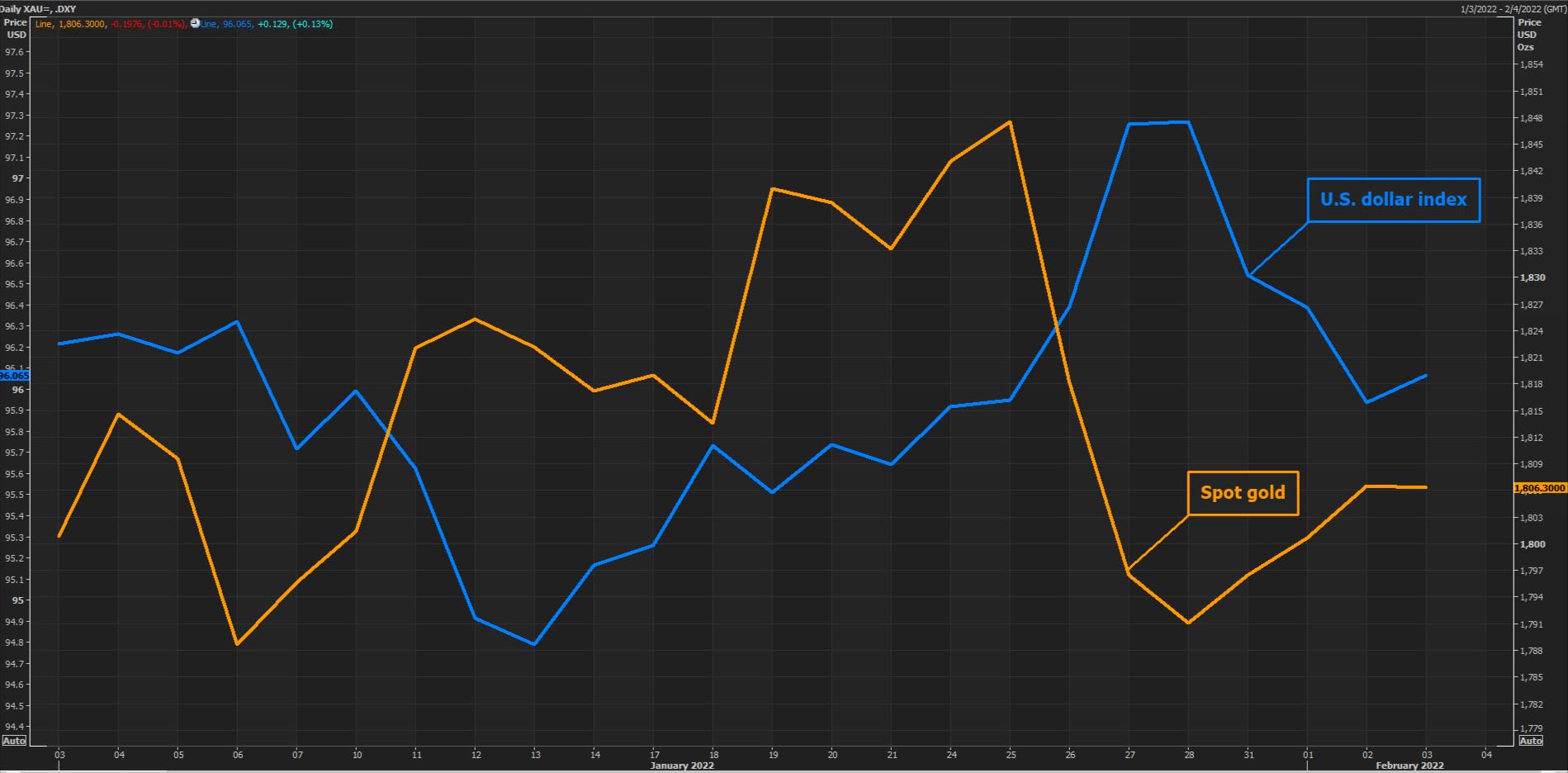 Giá vàng đã dao động quanh mức 1.800 USD/ounce gần đây trong bối cảnh thị trường tập trung theo dõi động thái của các ngân hàng trung ương lớn khi nền kinh tế của họ đối mặt với rủi ro lạm phát ngày càng tăng. Ngày 3/2, giá vàng có lúc đạt mức cao nhất trong vòng 1 tuần, với vàng giao ngay đạt 1.810,86 USD/ounce.