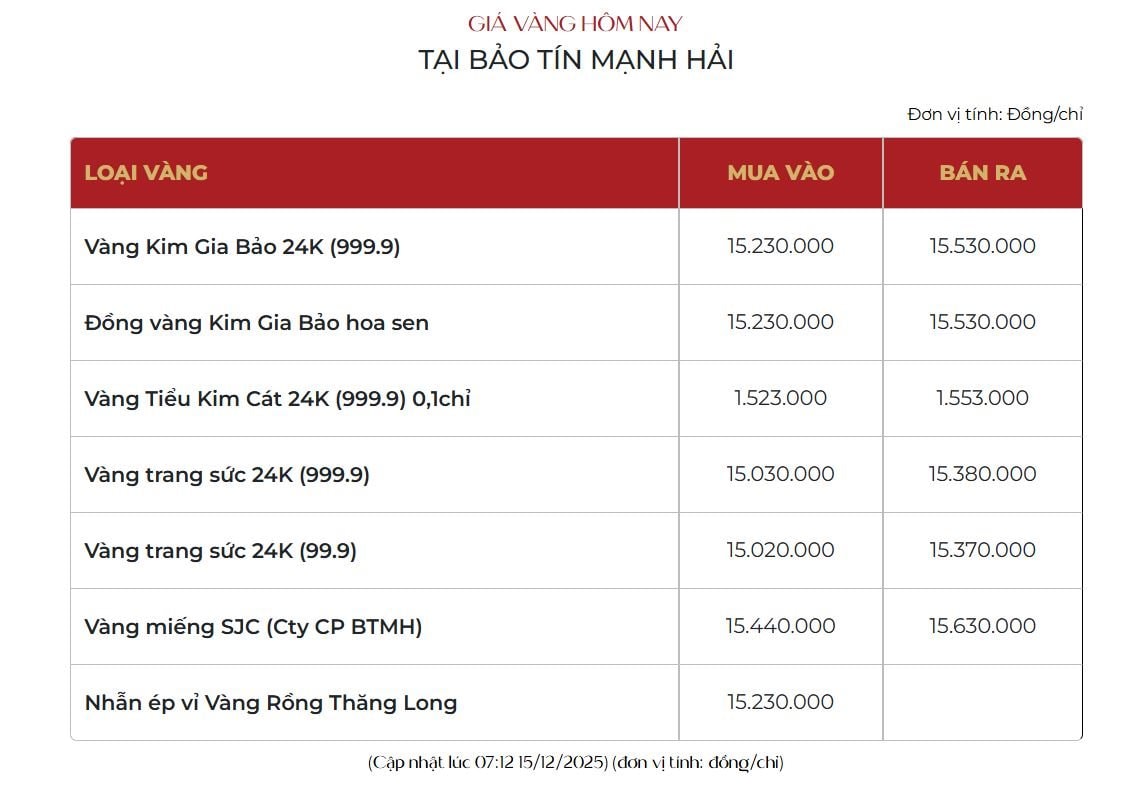 Giá vàng hôm nay tại Bảo Tín Mạnh Hải đã được cập nhật vào lúc 07 giờ 12 phút ngày 15/12/2025 với nhiều mức đáng chú ý cho các loại vàng khác nhau