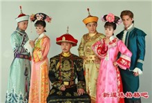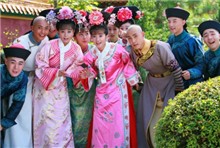Những gương mặt chính của "Tân Hoàn Châu Cách Cách". Từ trái qua: Phúc Nhĩ Khang, Hạ Tử Vi, vua Càn Long, Ngũ A Ca, Tiểu Yến Tử, anh chàng ngoại quốc Benjamin (người thứ ba chen vào mối tình của Tiểu Yến Tử và Ngũ A Ca).