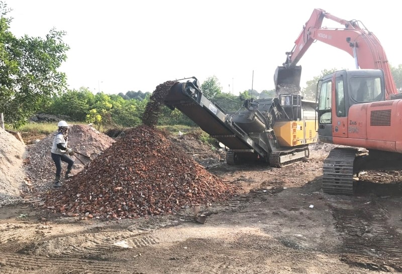 Tái chế chất thải rắn xây dựng tại khu vực nút giao Pháp Vân - Cầu Giẽ (quận Hoàng Mai). Ảnh: Minh Vân