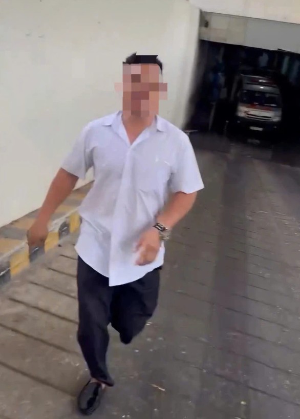Người đàn ông áo trắng lao vào xô xát với người quay video tại lối ra vào nhà đại thể của Bệnh viện Đa khoa Đồng Nai - Ảnh: Cắt từ clip