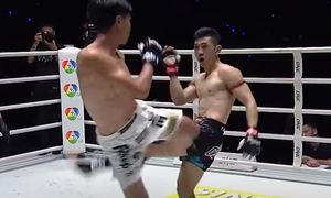 Antar Kacem đưa ngón tay lên miệng, hướng về phía đối thủ. Cần nhấn mạnh rằng Muangthai - hay Thanousin Jaroendee - là một trong những ngôi sao được yêu thích tại Thái Lan. Anh từng giành đai vô địch ở võ đài Lumpinee danh tiếng khi mới 17 tuổi.