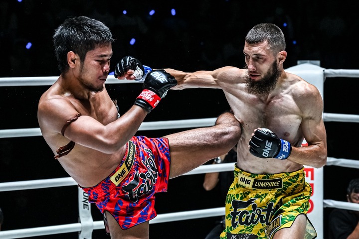Antar Kacem (bên phải) đánh bại Muangthai đầy thuyết phục nhưng lại gây tranh cãi vì hành xử bất lịch sự.