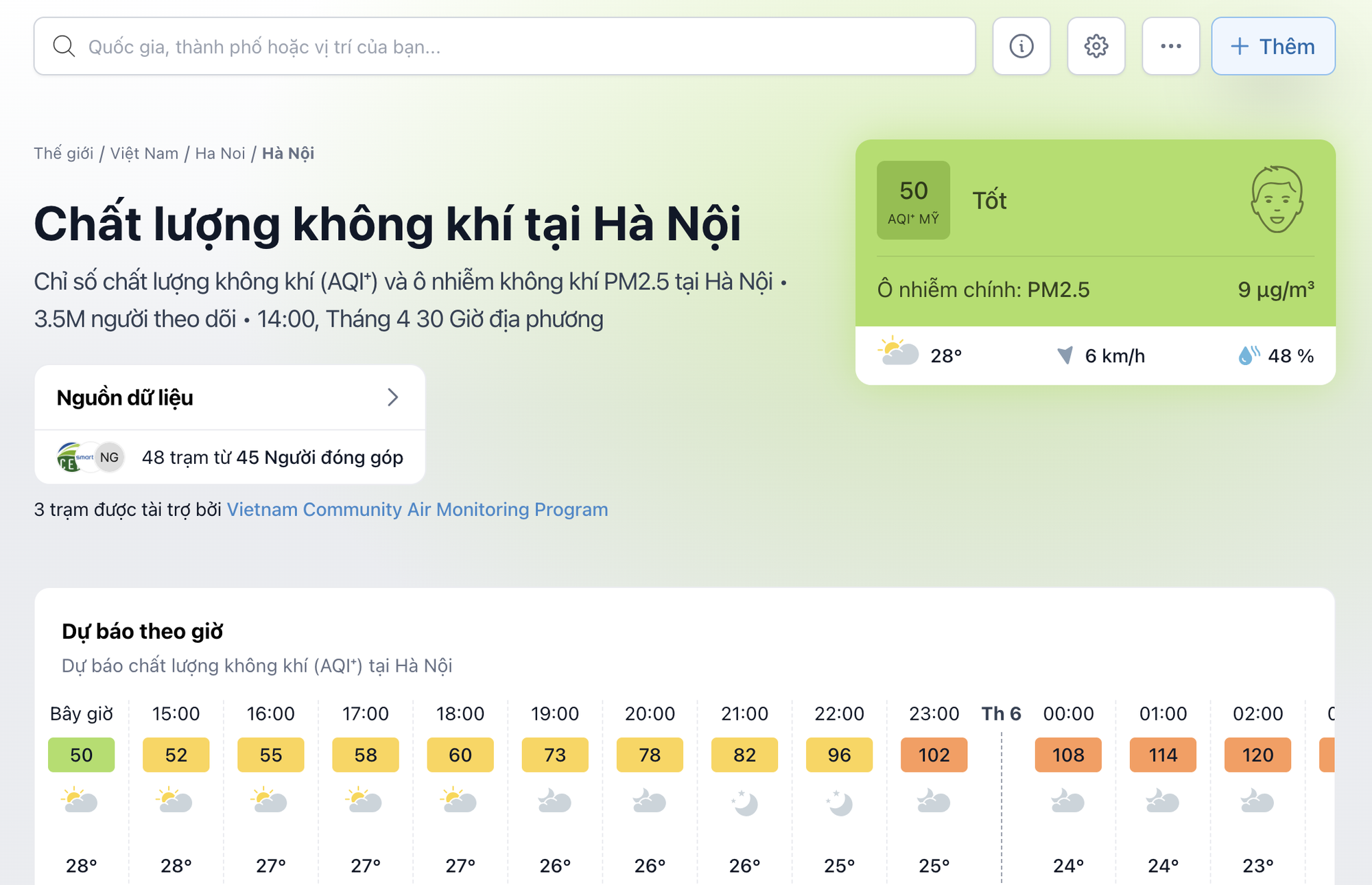 Theo dữ liệu từ IQAir, AQI buổi sáng dao động khoảng 39–45, thuộc nhóm “Tốt” – mức mà Hà Nội không phải lúc nào cũng đạt được. Đến đầu giờ chiều (khoảng 14h), chỉ số tăng nhẹ lên khoảng 50, vẫn nằm trong ngưỡng an toàn, dễ chịu cho các hoạt động ngoài trời.
