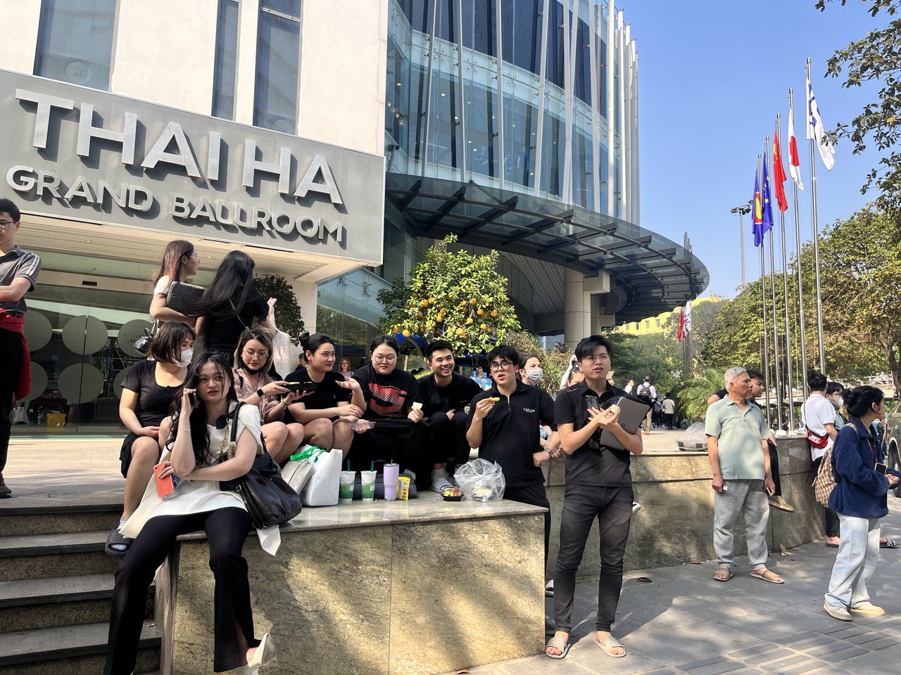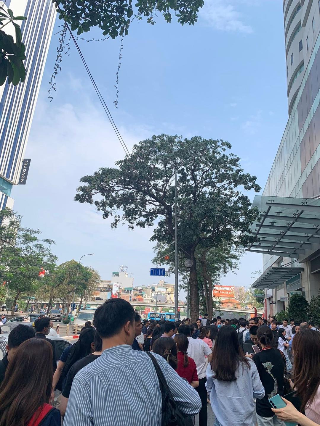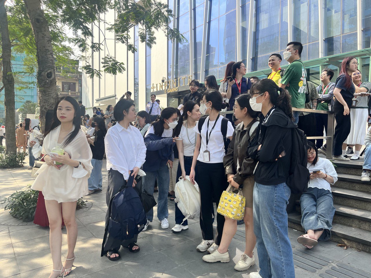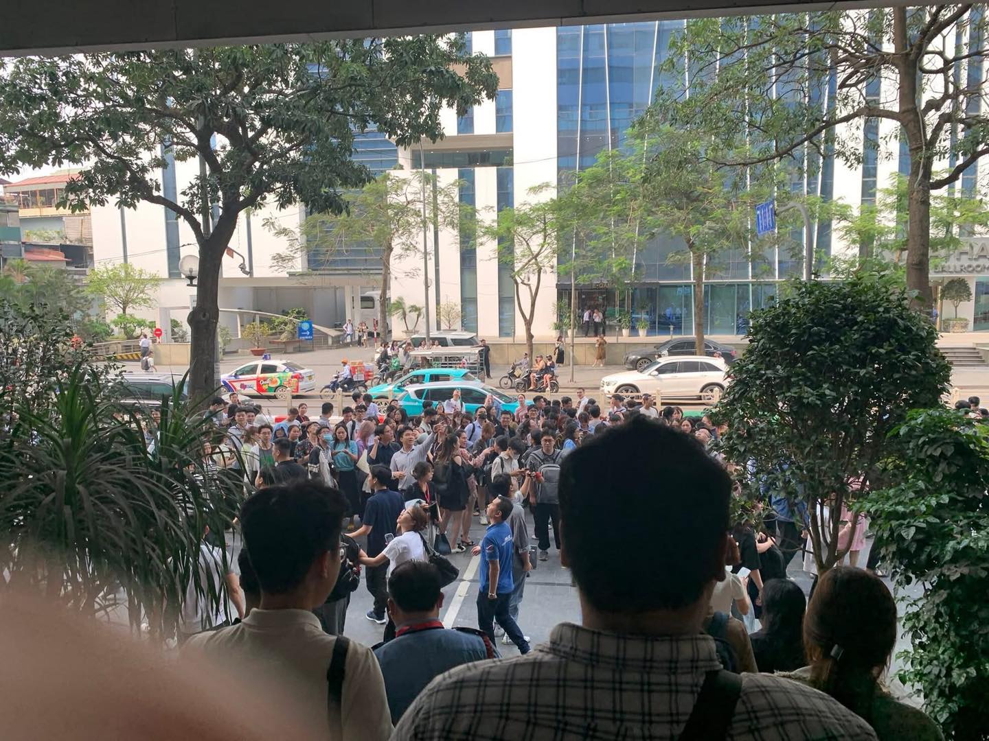 Nhiều người tập trung đứng dưới khu vực sảnh sau khi xảy ra vụ cháy (Ảnh: Phạm Huyền)