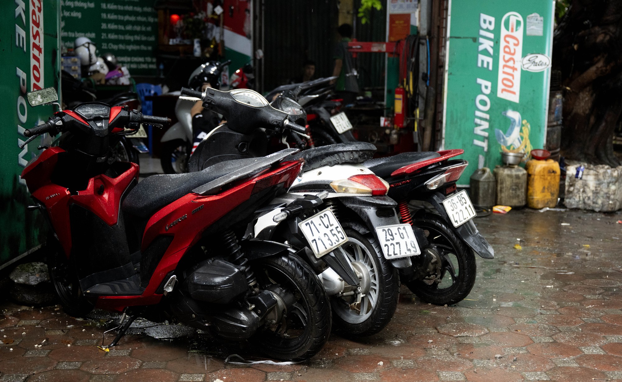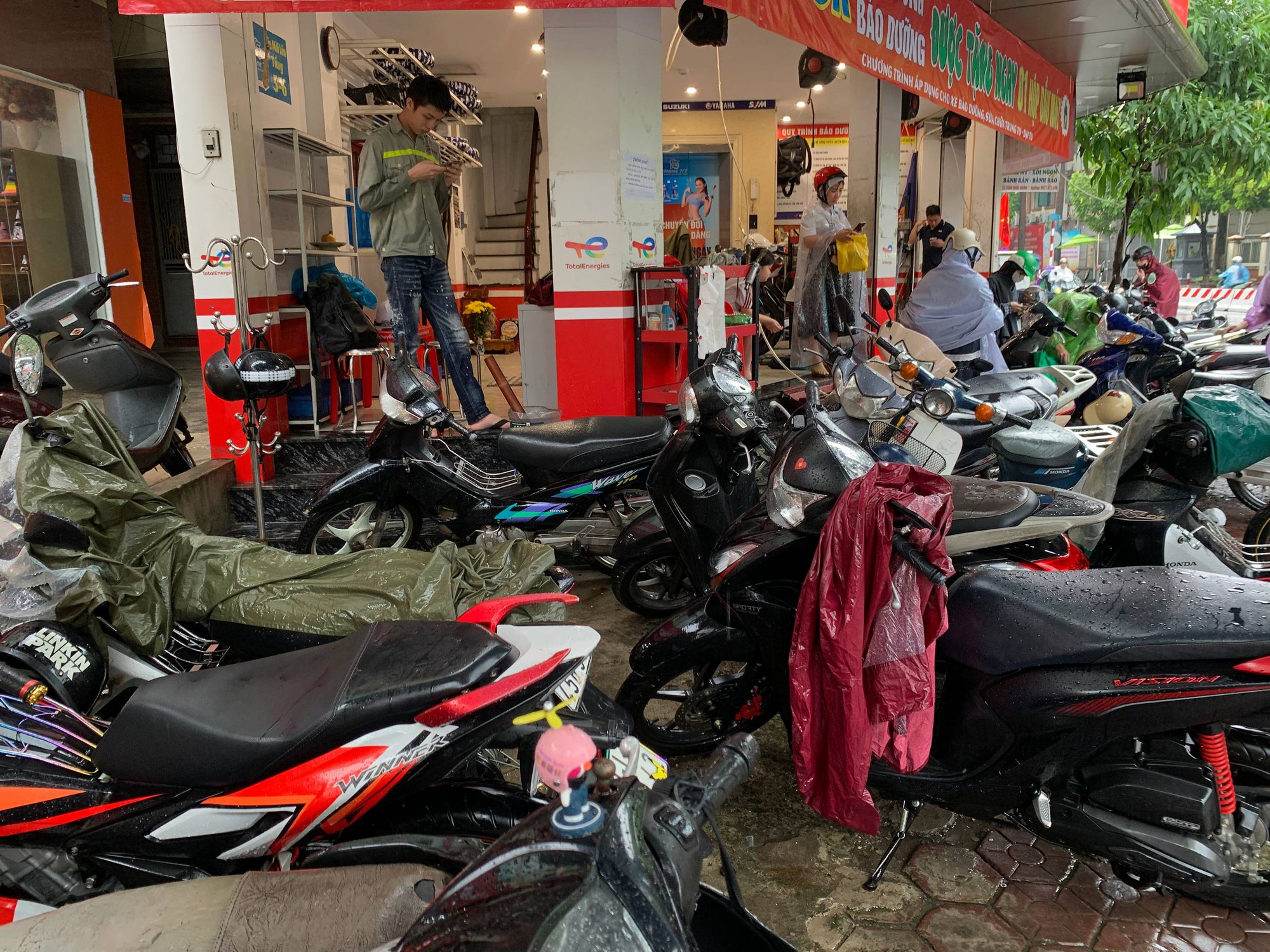 Hàng loạt phương tiện chết máy giữa đường, giao thông nhiều nơi tê liệt. Các cửa hàng sửa xe máy vì thế rơi vào tình trạng quá tải, hàng chục xe máy xếp hàng chờ sửa chữa.