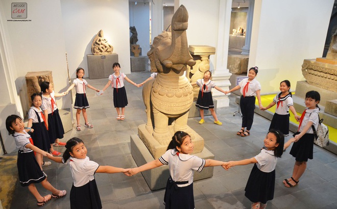 Du khách xem tượng Gajasimha trong bảo tàng Chăm. Ảnh: BT.