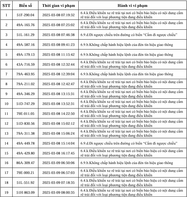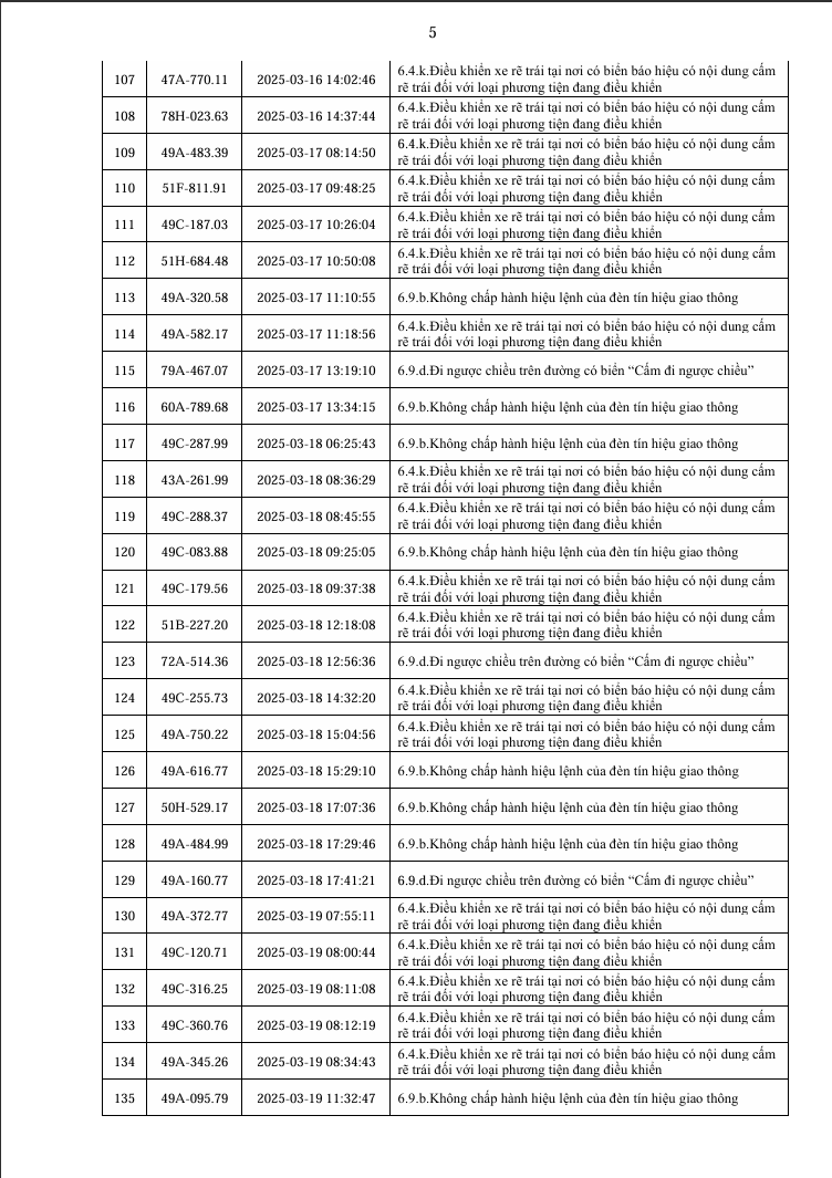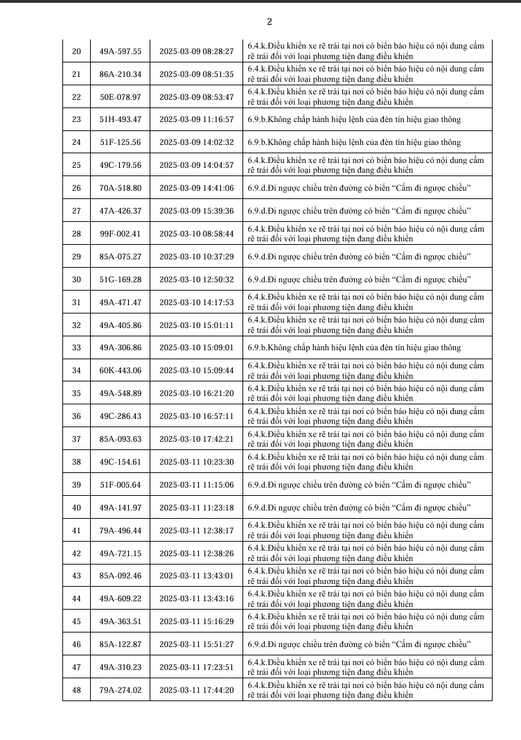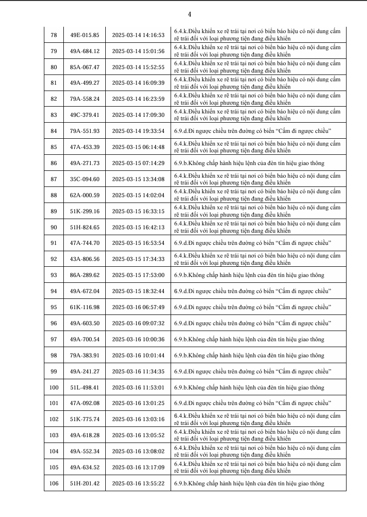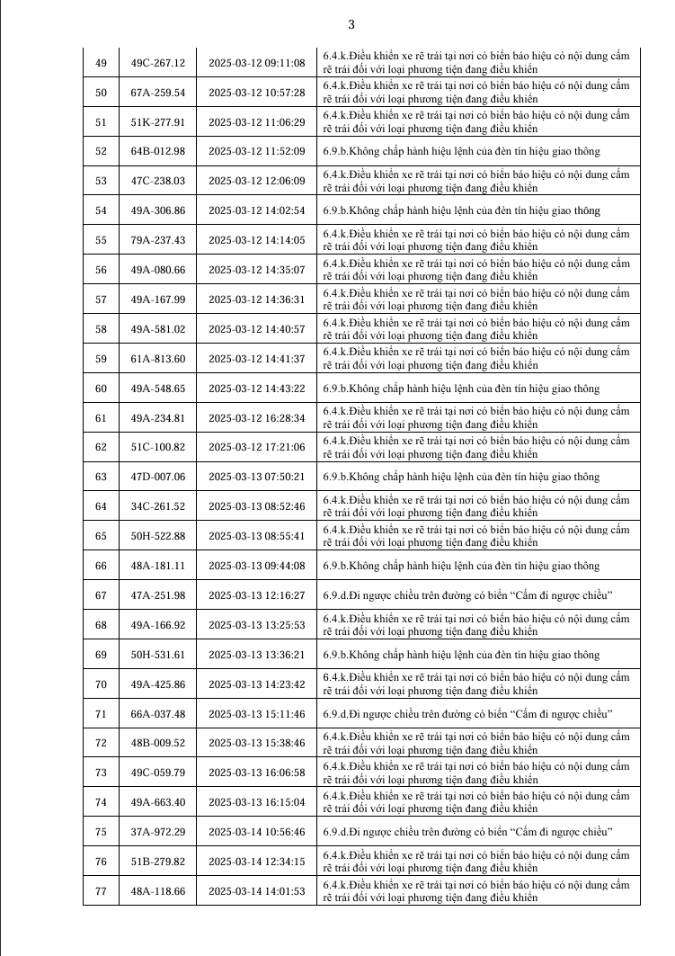 Ngoài ra còn có các lỗi đi ngược chiều, vượt đèn đỏ. Phòng Cảnh sát Giao thông Công an tỉnh Lâm Đồng thông báo danh sách phương tiện, thời gian và hành vi cụ thể như sau: