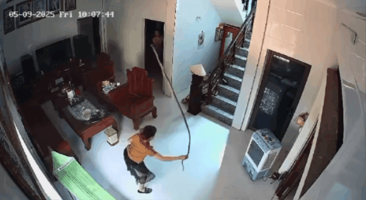 Theo hình ảnh trong clip, vào khoảng hơn 10 giờ sáng ngày 9/5, một người phụ nữ bất ngờ từ bên trong nhà lao lên phòng khách. Trên tay chị cầm một vật thể màu đen dài ngoằng. Ban đầu, nhiều người lầm tưởng đó chỉ là một sợi dây, nhưng khi quan sát kỹ hơn, ai nấy đều không khỏi bàng hoàng nhận ra đó là một con rắn còn đang ngoe nguẩy.