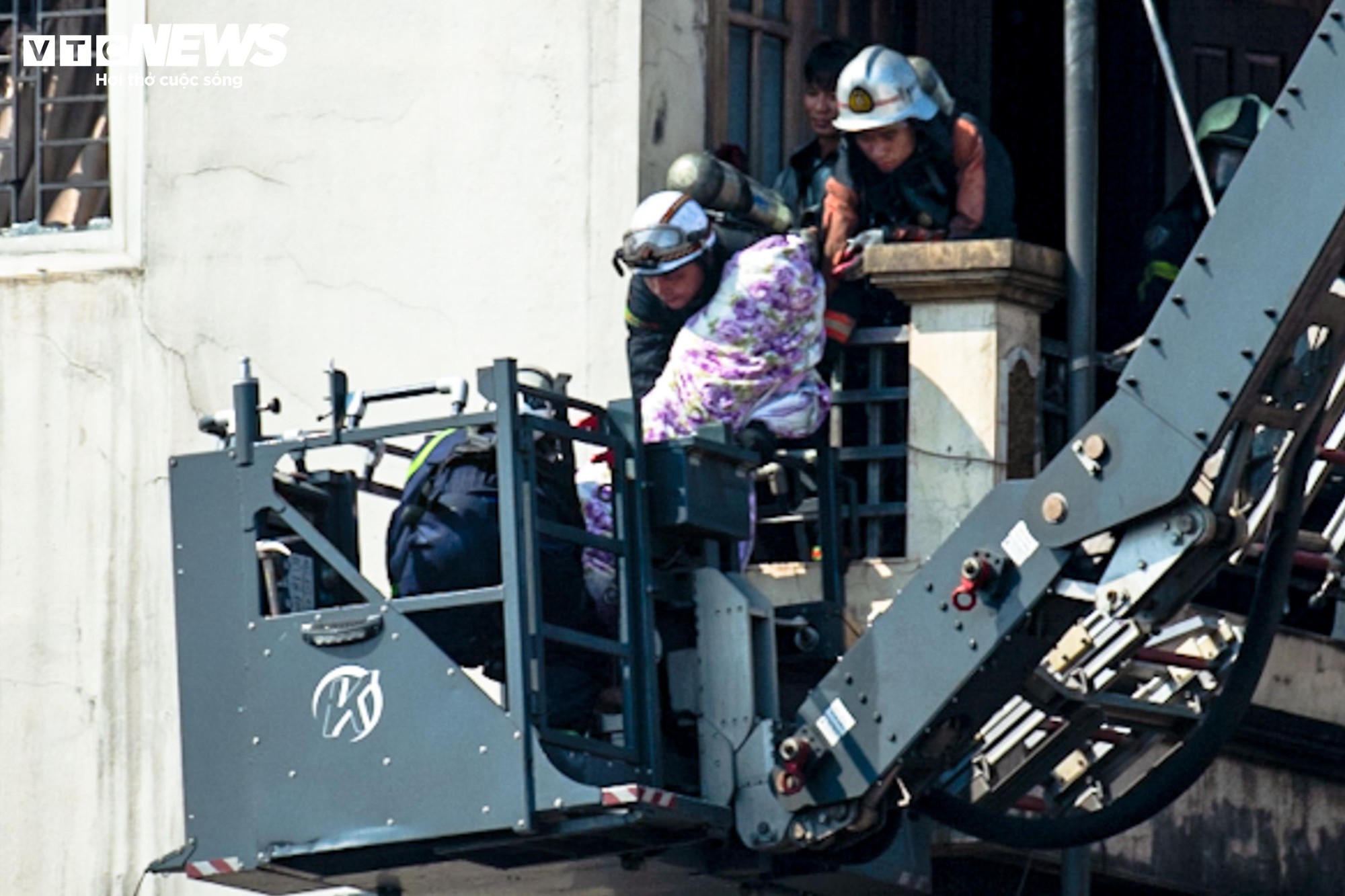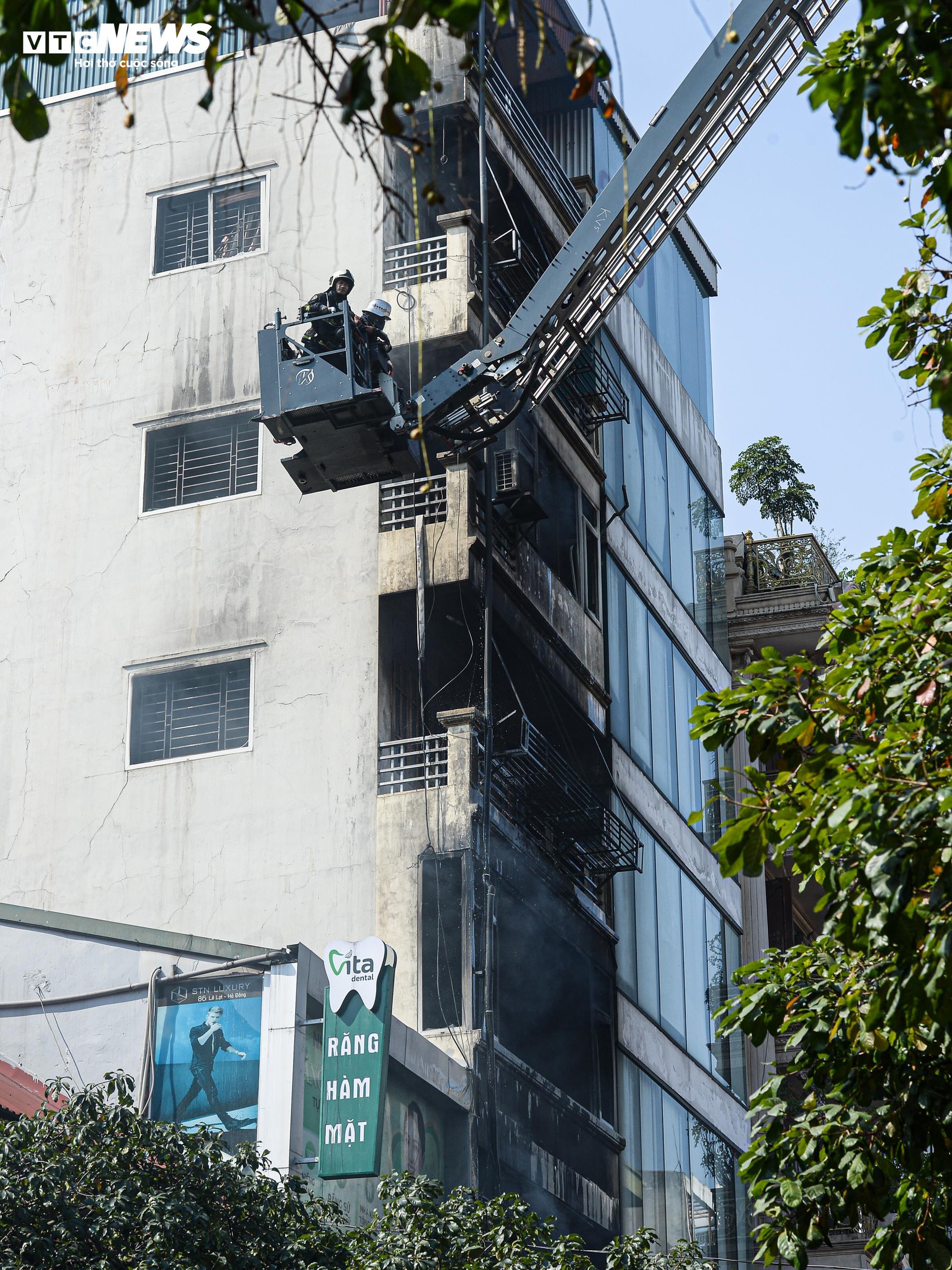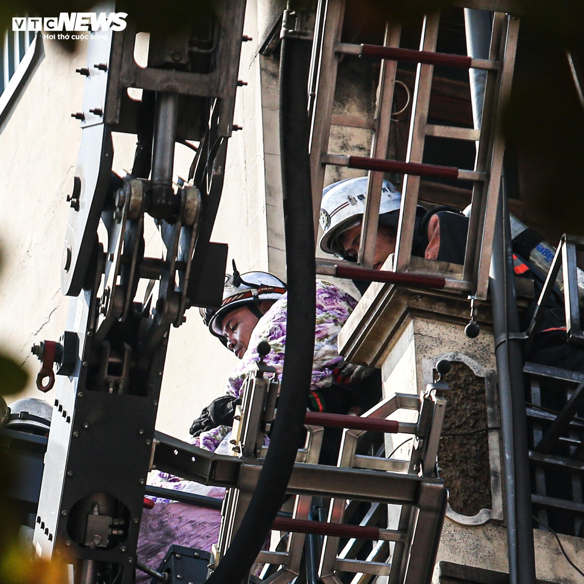 Đến gần 13h cùng ngày, xe thang chuyên dụng được nâng lên tầng 6 của ngôi nhà để tiếp cận, đưa nạn nhân xấu số ra ngoài. Hai người tử vong được xác định là bà Vũ Thị S. (SN 1937) và anh Lê Minh T. (SN 1999).