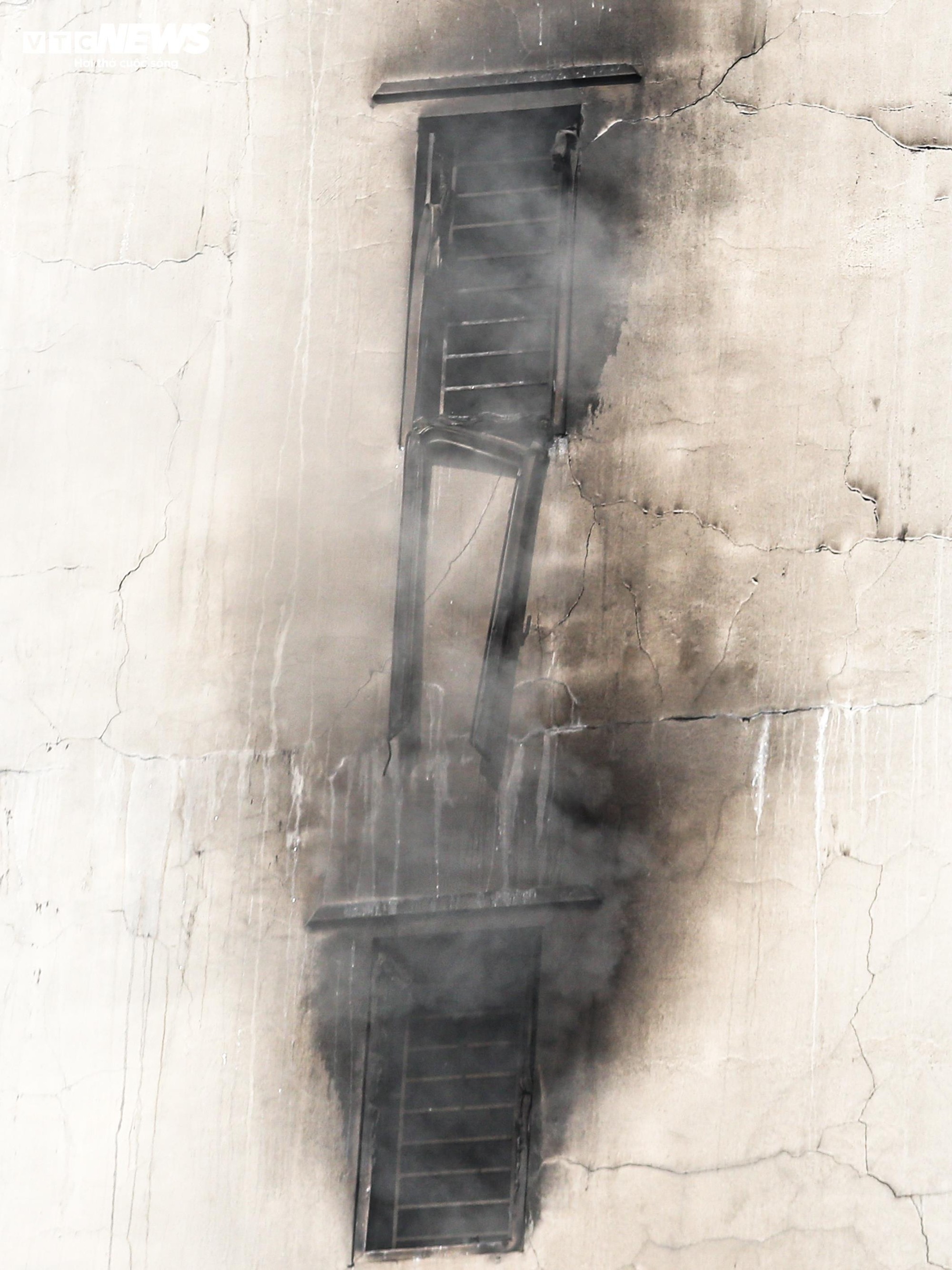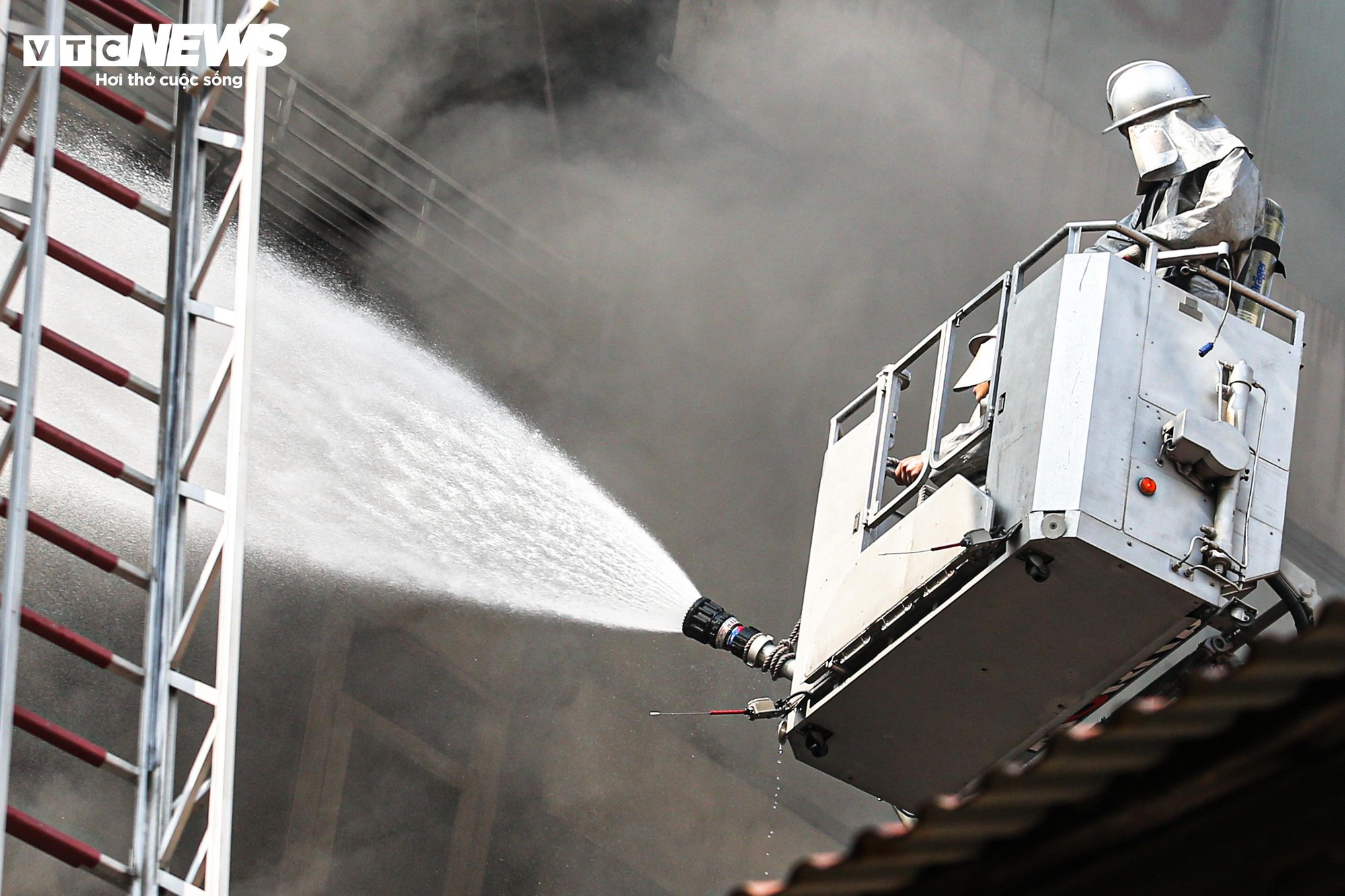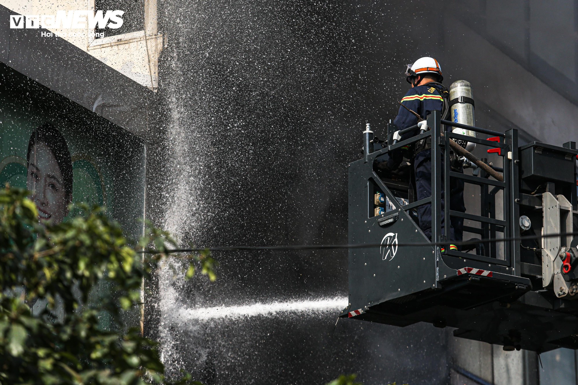 Lực lượng chức năng phải triển khai phun nước từ bên ngoài, thông qua nhiều ô cửa sổ ở các tầng nhằm tiếp cận và dập lửa từ nhiều hướng.