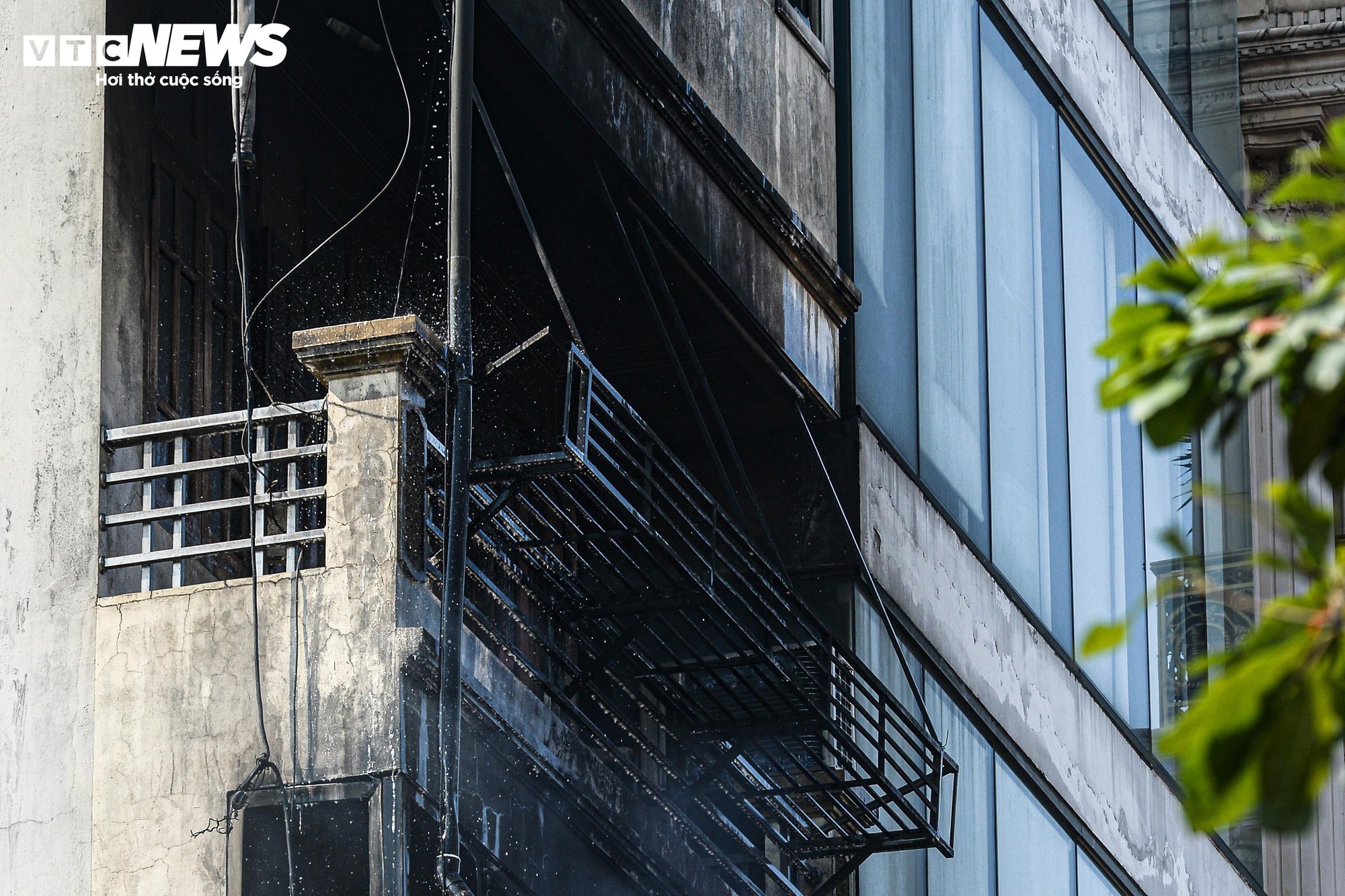 Sau vụ hỏa hoạn, căn nhà 7 tầng trên phố Lê Lợi (Hà Nội) chỉ còn lại khung, các tầng phủ kín muội khói, nhiều đồ đạc đổ sập, không gian nồng nặc mùi khét.