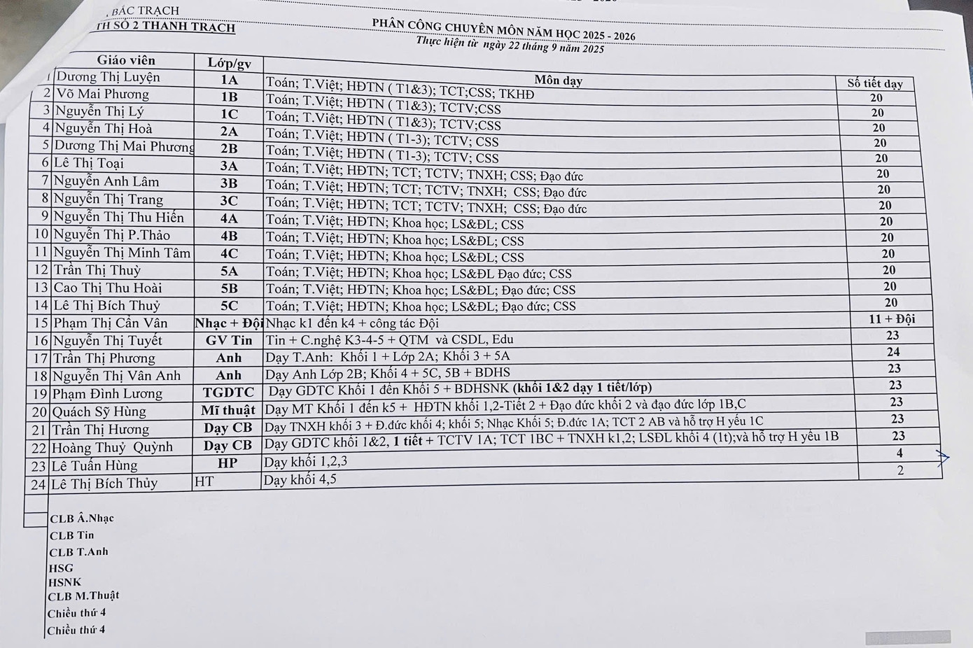 Lịch phân công chuyên môn không có tên Hiệu trưởng và Phó Hiệu trưởng nhà trường.