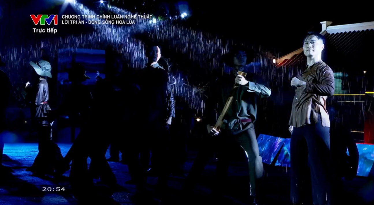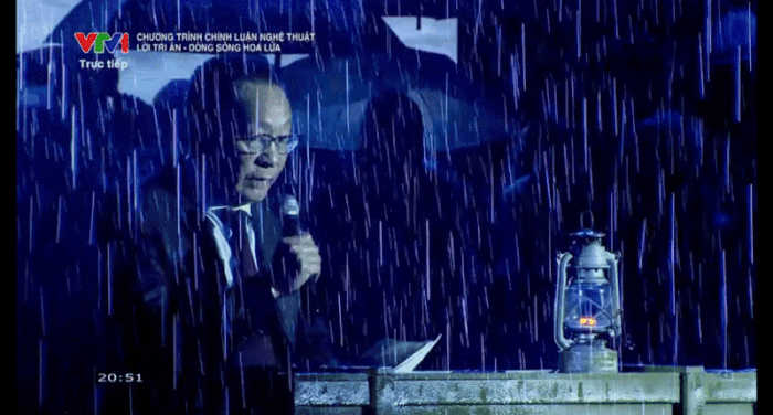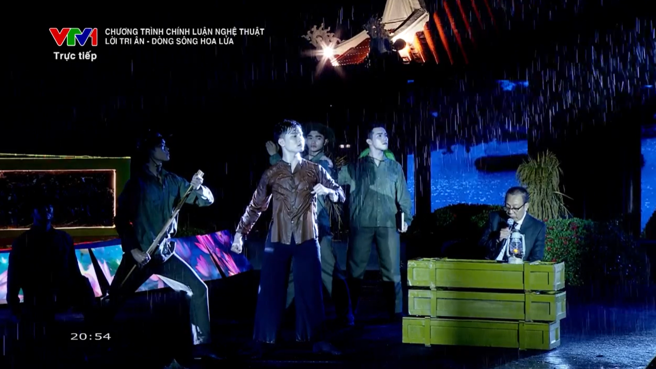 Là 1 trong 2 người dẫn chương trình, nhà báo Lại Văn Sâm có những chia sẻ đầy cảm xúc, không giấu nổi sự xúc động khi nhắc lại câu chuyện về 16 thanh niên xung phong đã hy sinh. Dù chương trình diễn ra dưới trời mưa to nhưng nam MC vẫn ngồi giữa sân khấu mà không che chắn, cả mắt kính lẫn gương mặt, quần áo đều ướt sũng nước.