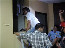 "Hiệp sĩ" Minh Tiến (đội nón bảo hiểm) truy lùng tên cướp trong trụ sở ngân hàng. Ảnh:An Nhơn.