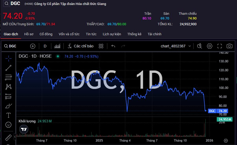 Theo danh mục Vay ký quỹ của Chứng khoán TCBS cập nhật ngày 18/12/2025, cổ phiếu DGC đã bị hạ giá trần cho vay margin từ 105.600 đồng/cp trong phiên liền trước xuống còn 70.000 đồng/cp. Tỷ lệ cho vay vẫn được giữ nguyên ở mức 50%.