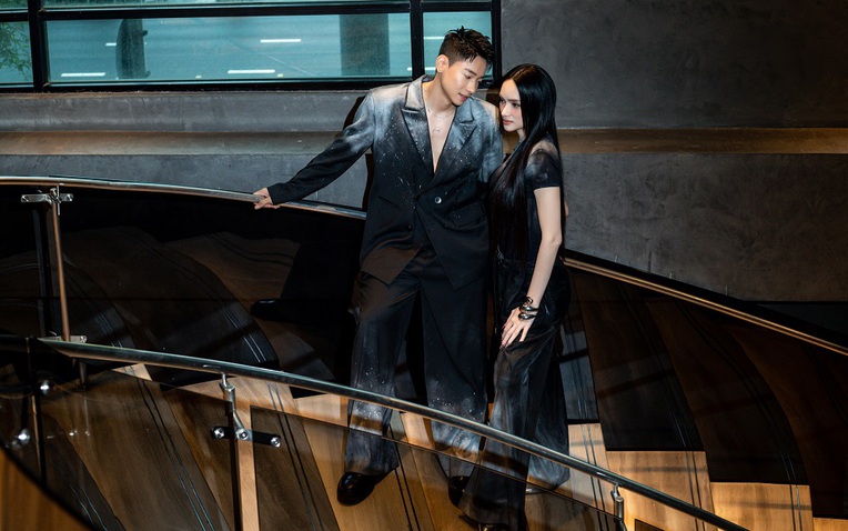 Hương Giang mặc áo thun đen ôm sát, quần ống rộng trong khi Phú Cường lịch lãm với suit phom suông màu loang. Tại sự kiện này, cặp đôi được công bố là đại sứ thương hiệu của một nhãn hàng thời trang nổi tiếng.