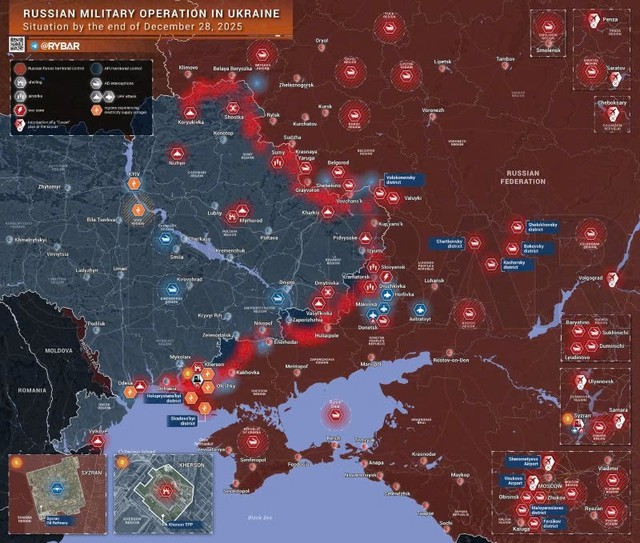 Bản đồ chiến sự Ukraine ngày 28/12/2025. (Ảnh: Rybar)