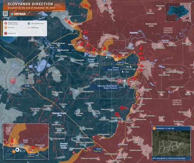 Bản đồ chiến sự Ukraine ngày 28/12/2025, hướng Slovyansk. (Ảnh: Rybar)