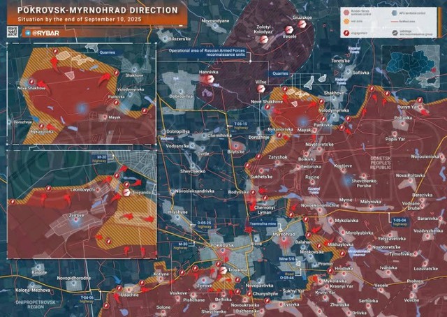 Bản đồ chiến sự Ukraine ngày 10/9/2025, hướng Pokrovsk-Myrnohrad. (Ảnh: Rybar)