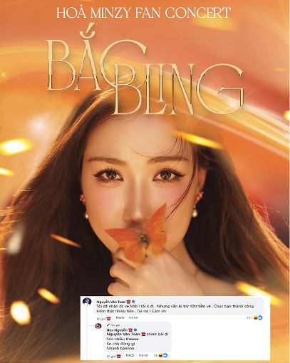 Hòa Minzy mới đăng tải thông báo về Fan Concert đầu tiên mang tên "Bắc Bling" dự kiến tổ chức vào 1/2/2026 tại TP.HCM, cầu thủ Nguyễn Văn Toàn đã để lại bình luận trêu chọc người bạn thân. Nam cầu thủ hóm hỉnh cho biết dù anh nhận được vé mời và sẽ không đi, nhưng vẫn bị "trừ 10 triệu tiền vé". Anh chốt lại bằng lời chúc đậm mùi "chủ nợ": "Chúc bạn thành công kiếm thật nhiều tiền. Trả nợ! Cảm ơn" .