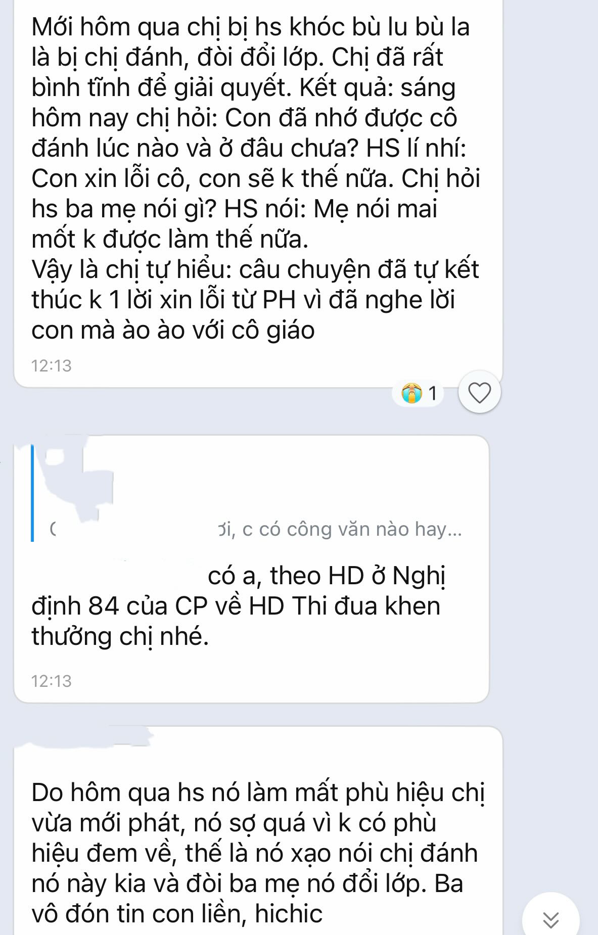 Đáng chú ý, cô giáo này còn cho biết: trường có ca học sinh tự cắn tay rồi chụp ảnh làm "bằng chứng" đổ cho cô giáo. Nhà trường kiểm tra camera, cô chủ nhiệm, đồng nghiệp đối chiếu mới ra sự thật: lúc giơ tay phát biểu không được gọi, em tự cắn rồi vu cho cô. Phụ huynh vẫn khăng khăng "cô đánh", thậm chí bảo trường tác động tâm lý để bé nhận sai, hoặc "tự dựng camera".