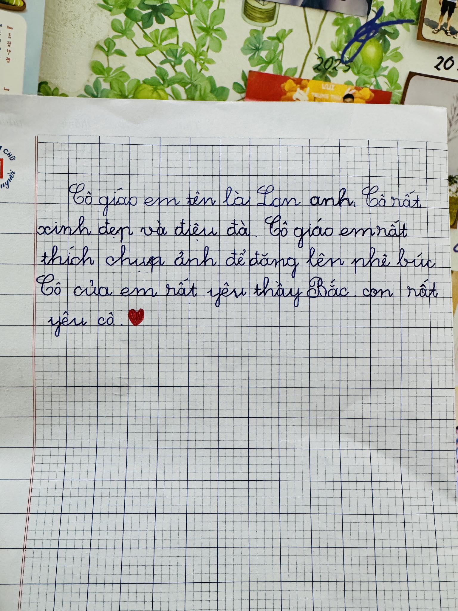 Một bà mẹ mới đây chia sẻ bài tập làm văn của con mình lên mạng xã hội khiến cộng đồng mạng cười nghiêng ngả. Với đề bài quen thuộc: tả cô giáo, cậu bé hồn nhiên viết: "Cô giáo em tên là Lan Anh. Cô rất xinh đẹp và điệu đà. Cô giáo em rất thích chụp ảnh để đăng lên phê búc (facebook). Cô của em rất yêu thầy Bắc, con rất yêu cô".