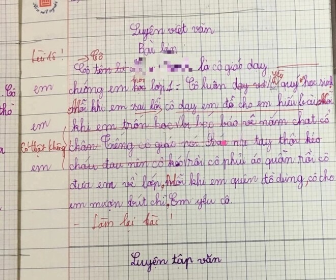 Có thể bài văn bị yêu cầu làm lại vì sai quá nhiều chính tả và diễn đạt chưa đúng yêu cầu. Nhưng theo cách nào đó, em học sinh đã hoàn thành một việc còn quan trọng hơn: khiến người lớn mỉm cười và nhớ rằng, thế giới tuổi thơ luôn cần được giữ lại chút hồn nhiên như vậy.