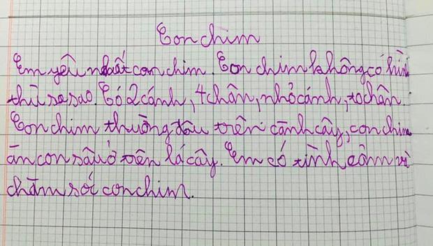Nguyên văn bài làm như sau: "Em yêu nhất con chim. Con chim không có hình thù ra sao. Có 2 cánh, 4 chân, nhỏ cánh, to chân. Con chim thường đậu trên cành cây, con chim ăn sâu ở trên lá cây. Em có tình cảm và chăm sóc con chim".