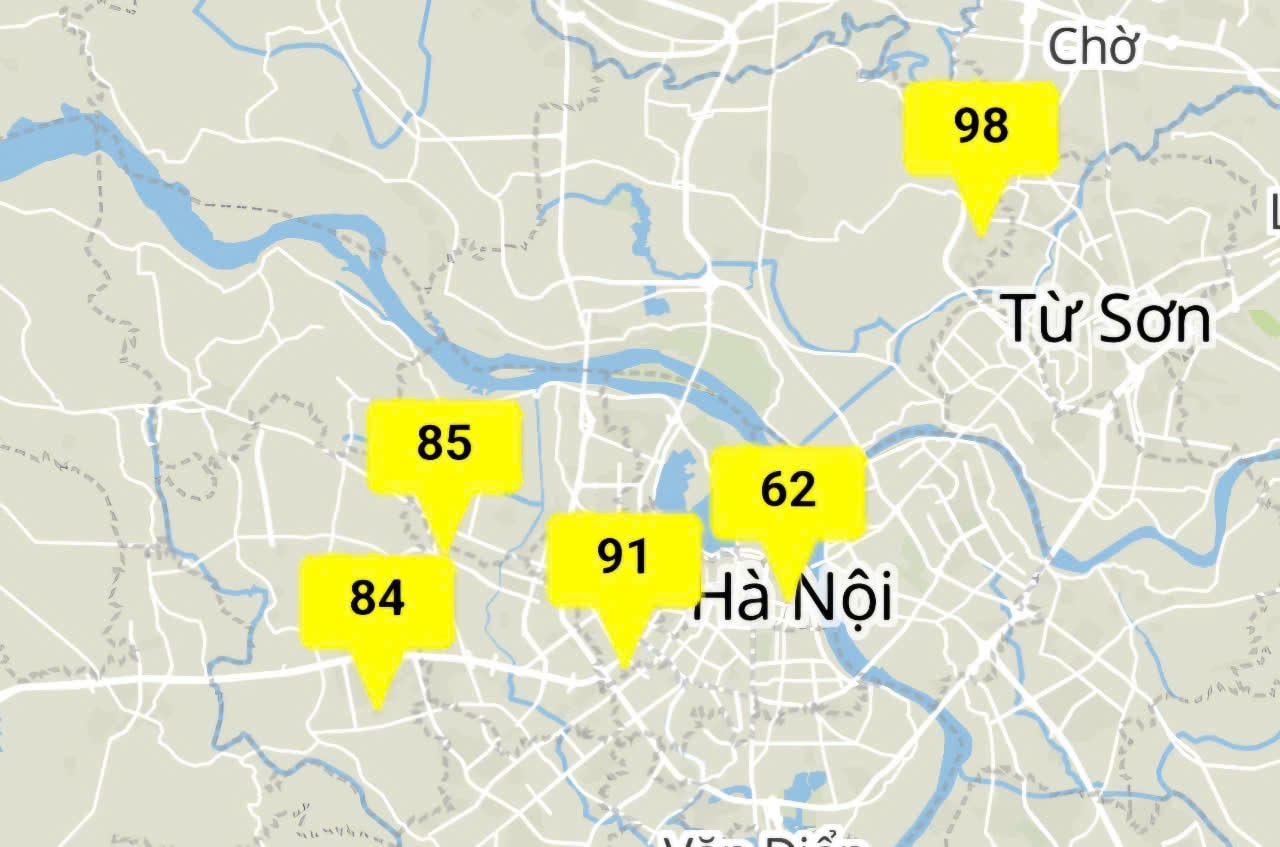 Kết quả trên trang moitruongthudo.vn do Sở Nông nghiệp và Môi trường Hà Nội công bố lúc 9h cho thấy, cả 5 khu vực đặt trạm quan trắc có chỉ số chất lượng không khí ở mức trung bình. Cụ thể, khu vực xã Vân Hà (huyện Đông Anh) có chỉ số AQI ở ngưỡng 98 (tiệm cận ngưỡng kém); phố Lưu Quang Vũ, phường Trung Hòa (quận Cầu Giấy) ở ngưỡng 86; phường Minh Khai (quận Bắc Từ Liêm) ở ngưỡng 85; xã An Khánh (huyện Hoài Đức) ở ngưỡng 84; số 50 Đào Duy Từ (quận Hoàn Kiếm) ở ngưỡng 62.