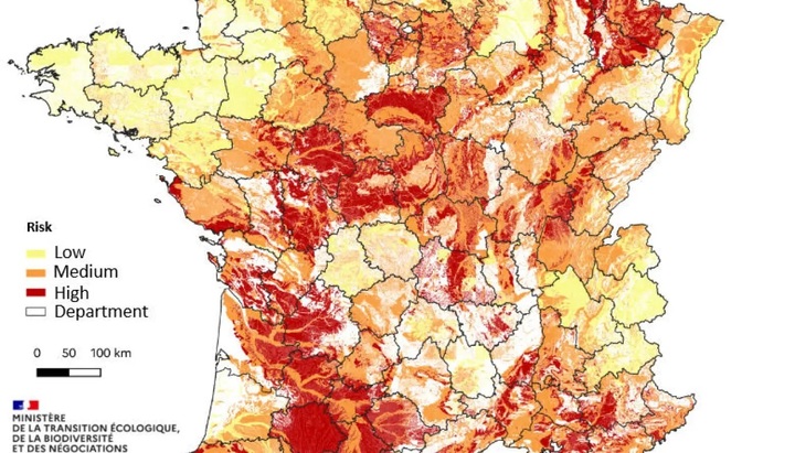 Bản đồ mới nhất do chính phủ Pháp công bố cho thấy các khu vực dễ bị tổn thương nhất gồm Allier, Alpes-de-Haute-Provence, Dordogne, Gers, Indre, Lot-et-Garonne, Meurthe-et-Moselle, Nord, Puy-de-Dôme, Tarn và Tarn-et-Garonne. Khoảng 3 triệu ngôi nhà tại các khu vực này được xếp vào nhóm "rủi ro cao".