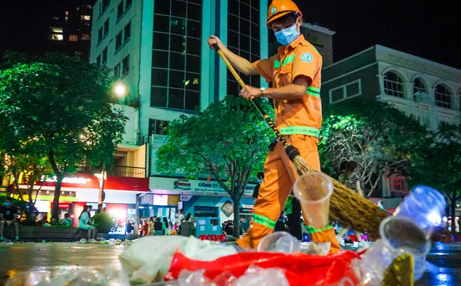 Anh N.V.T nhân viên vệ sinh thuộc một công ty môi trường quận 1 cho biết luôn cảm thấy "ngao ngán" vì năm nào tình trạng này cũng diễn ra và những lao công như anh luôn phải làm việc tới sáng mới xong. |