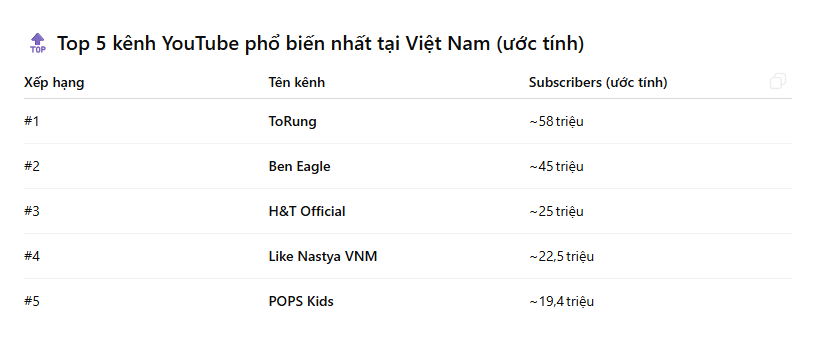 Trong vòng chưa đầy 2 năm, kênh BEN EAGLE cán mốc 20 triệu lượt đăng ký là là kênh YouTube đạt nút kim cương YouTube nhanh nhất tại Việt Nam. Hiện tại, theo thống kê trên Social Blade và vidIQ, BEN EAGLE - hơn 45 triệu lượt đăng ký là kênh YouTube lớn thứ 2 tại Việt Nam, chỉ sau kênh ToRung - 58 triệu lượt đăng ký.