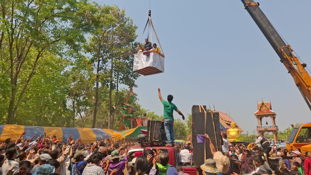 Buổi lễ dâng lễ vật và đặt viên đá nền xây tượng Phật của Somjit Bo Thong và Mae Kru Homhual Theprungruang tại chùa, đã thu hút 500 dân làng kéo tới xem. Ngoài ca hát cúng thần linh, 2 ca sĩ này còn phát tiền cho người dân, với tổng số tiền là 100.000 baht (hơn 80 triệu đồng).