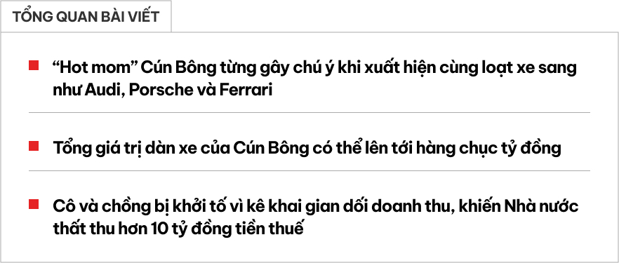 Cún Bông, sinh năm 1986 tại Hà Nội, gây dựng hình tượng “hot mom 7 con” trên mạng xã hội với gần 500.000 người theo dõi TikTok. Trước khi vướng vòng lao lý, Cún Bông và chồng thường xuyên khoe hình ảnh bên những mẫu xe hạng sang. Với thu nhập "khủng" như vậy, gia đình "hot mom" này sở hữu những chiếc xe đắt tiền là điều không quá khó hiểu.