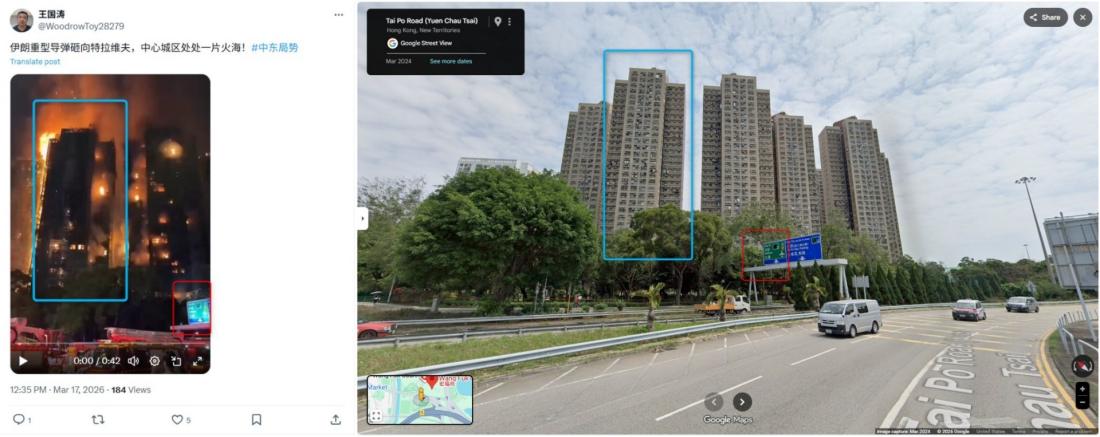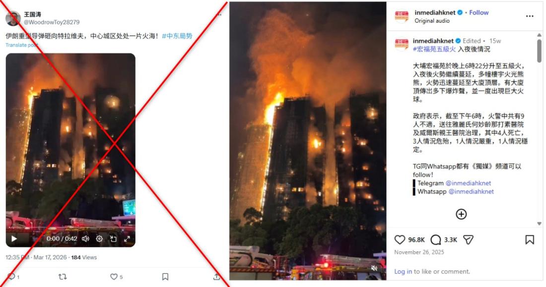 AFP nhận định, đoạn video trên đã được chia sẻ ở nhiều trang khác nhau trên nền tảng X bằng nhiều ngôn ngữ, nhưng thực tế đó là một vụ hỏa hoạn chết người ở quận Tai Po, Hồng Kông, Trung Quốc, vào năm 2025 và không liên quan gì đến cuộc xung đột ở Trung Đông.