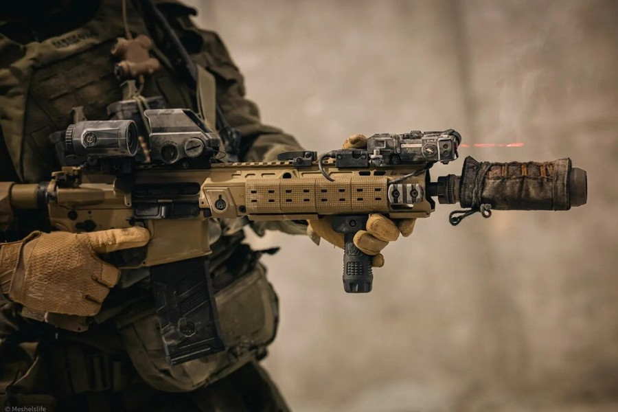 Góc nhìn ngang của một binh sĩ cầm khẩu carbine màu nâu cát được trang bị thiết bị laser 2 bước sóng Sting Lumina. Ảnh: Meprolight
